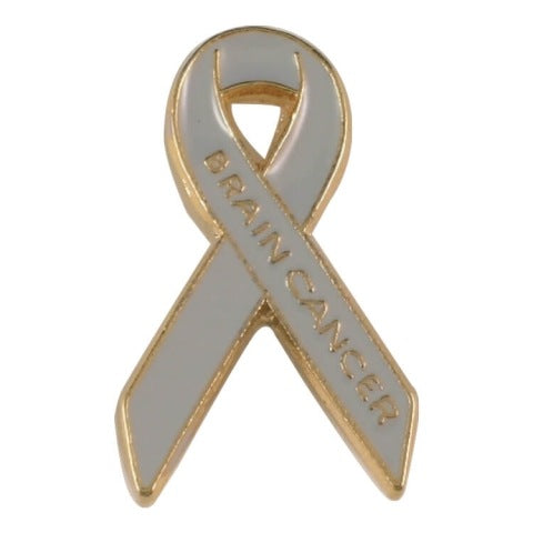 Awareness ribbon lapel pin cast in pewter and given a gold finish with gray color fill reading Brain Cancer Awareness. This gray awareness ribbon lapel pin is widely recognized as the symbol for brain cancer awareness, substance abuse/addiction awareness, and diabetes awareness. It is an outward symbol for their cause worn by patients, survivors, families, doctors, nurses, and other support staff; many of them obtained through benefits, fund-raisers, and memorials.