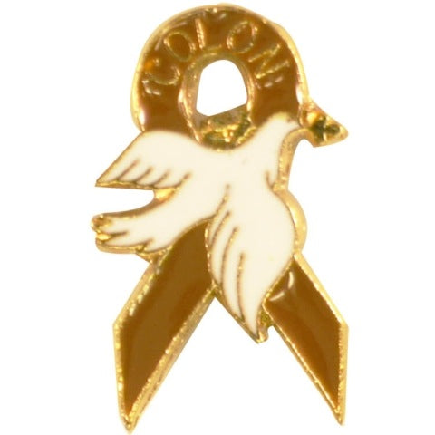 Gold finish pin with brown color filled ribbon with white color filled dove reads colon. This brown awareness ribbon lapel pin is widely recognized as the symbol for colon (Colorectal) cancer awareness and as a symbol of the anti-tobacco movement. It is an outward sign of support worn by patients, survivors, families, doctors, nurses, anti tobacco organizers and sympathizers and various supporters of each of these causes. March is National Colorectal Cancer Awareness Month.