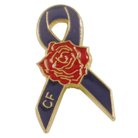 Purple ribbon pin with red rose and CF to indicate your support for cystic fibrosis. 1 X 5/8 cast in pewter and given a gold finish. Raise awareness and funds to support cystic fibrosis research and treatment with this colorful awareness ribbon lapel pin. May is Cystic Fibrosis Awareness Month.