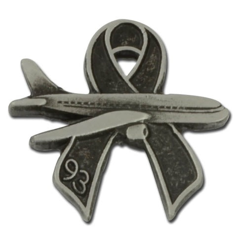 A ribbon with 93 on one tail flows behind a jet. This cast in pewter awareness ribbon lapel pin is dedicated to honoring the lives of the heroic passengers of flight 93 on September 11, 2001.