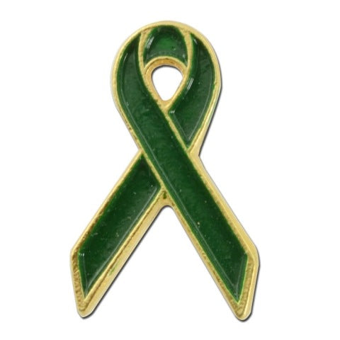 Green enamel lapel pin. The green ribbon is symbolizes awareness for environmental issues, organ donation, missing children, childhood depression, and kidney disease or kidney cancer.