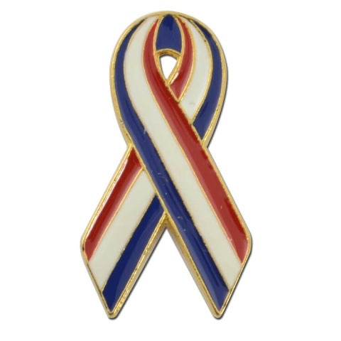 Cast pewter ribbon awareness pin in gold finish with red, white and blue soft enamel color fill. National pride and military awareness are tied together in this red, white, and blue stripped awareness ribbon lapel pin. Proudly worn by any military member, their families, or friends.